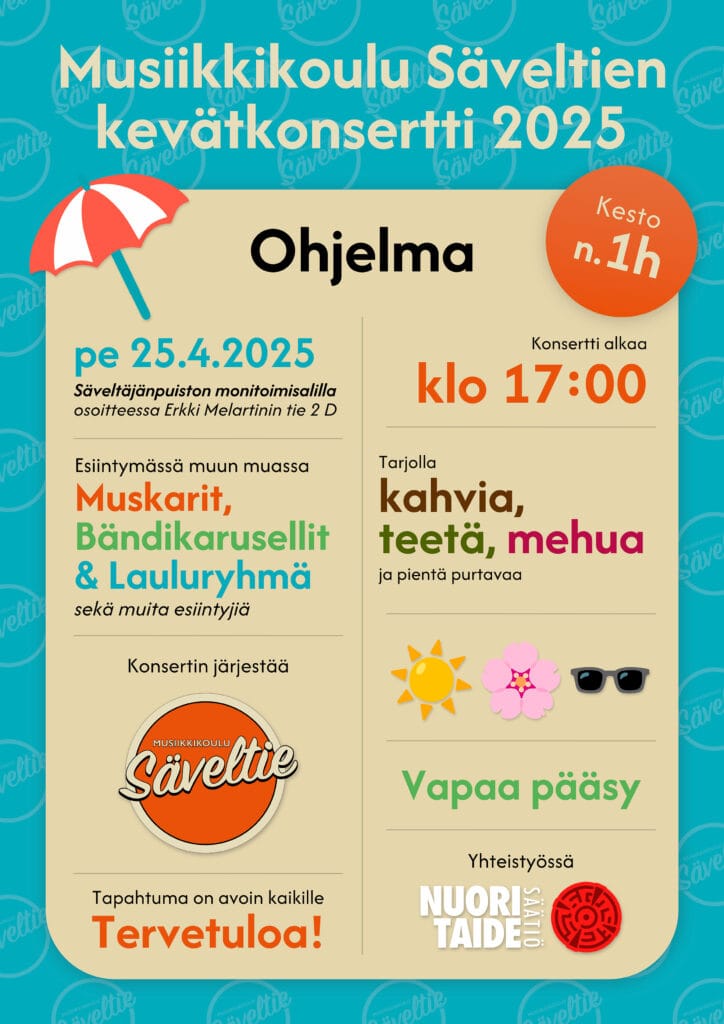 Join us for Musiikkikoulu Säveltie’s Spring Concert on Friday, April 25 at 5:00 PM! We’re excited to bring you a fantastic, diverse lineup of talented performers. You’ll hear performances by Säveltie’s music playschool students, two band carousel groups and a vocal ensemble . There will also be solo showcases from students on various instruments. Plus, the teachers at Säveltie will take the stage as the backing band and treat you to their own special performance.