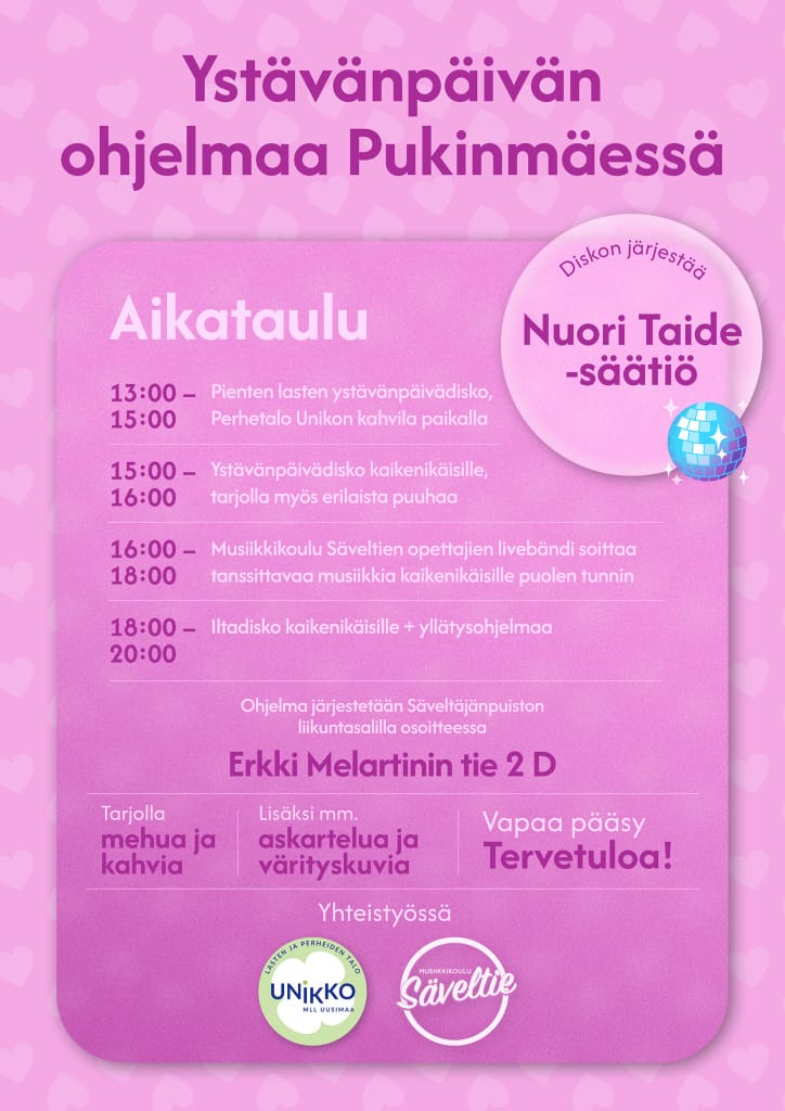 Ystävänpäivä lähestyy kovaa vauhtia. Haluamme yhdessä Nuori Taide -foundation and MLL Perhetalo Unikon kanssa tarjota ystävänpäiväksi kivaa tekemistä koko perheelle – ja mitä olisikaan ystävänpäivä ilman ystävänpäivädiskoa!